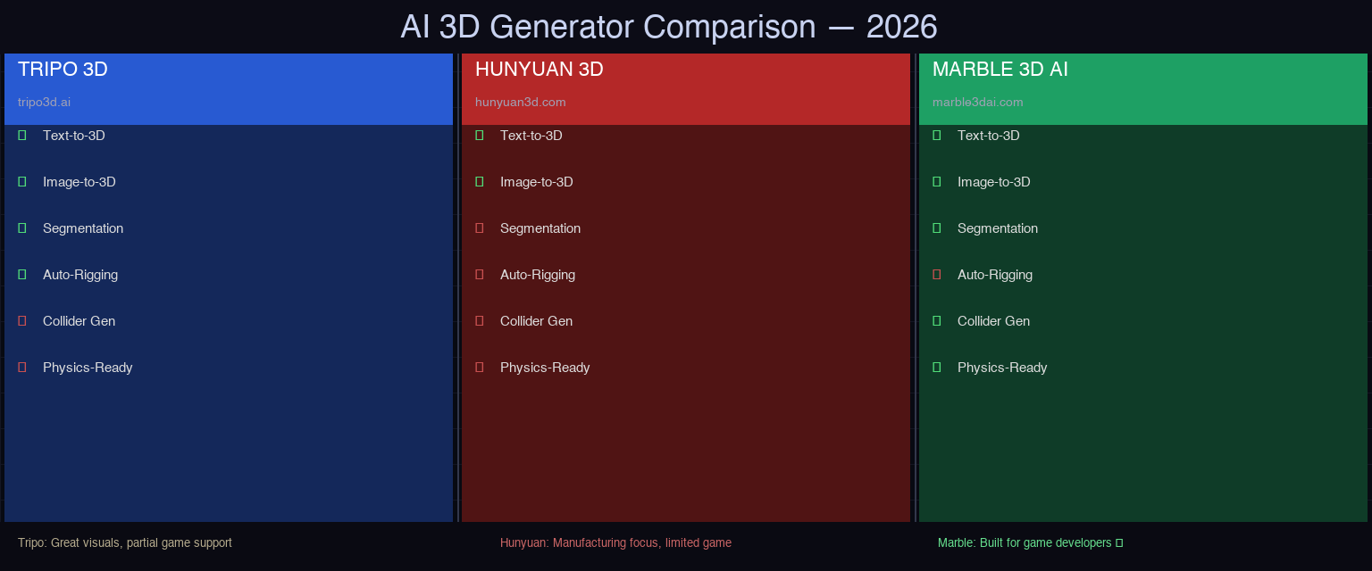 Tripo 3D vs Hunyuan 3D vs Marble — 2026 AI 3D Generator Comparison